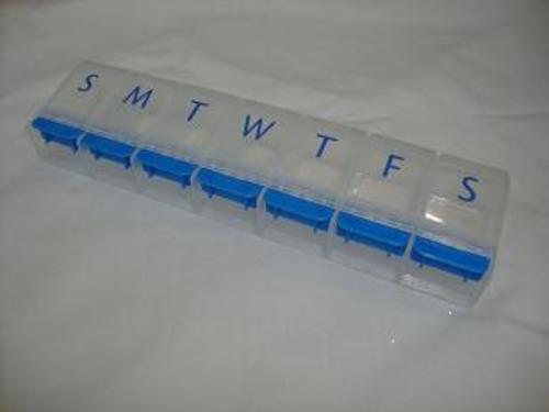A plastic, seven day pill / tablet dispenser, designed to hold one dose per day. It has separate lids for each dose. Lid opens by pushing down on the tab. Available in one size.