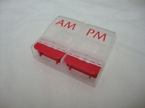 A plastic, one day pill / tablet dispenser, designed to hold two doses per day. It has separate lids for each dose. Lid opens by pushing down on the tab. Available in one size.
