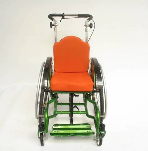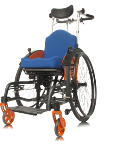 A rigid manual wheelchair with aluminium frame and designed for children, adolescents and small adults. It is self-propelled using a rear wheel action drive. It has a tilt in space feature and a range of accessories are available. Can be customised and can be used with some custom inserts. Crash tested.