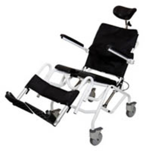 Attendant propelled tilt in space gas assisted shower commode chair. Soft ergonomic open front seat is made of Solid PU Foam and is removable for easy cleaning and infection control, and is supplied with PU Foam insert. Commode bowl and lid supplied as standard. Tension adjustable fabric backrest made from anti-bacterial washable fabric. Padded swing away armrests for side transfers. Height adjustable/swing away leg-rests and adjustable padded headrest. Supplied with calf strap and removable buckle seat belt. Brakes on all four castors. Available in two sizes. SWL 120kg. Not designed to go over a toilet.