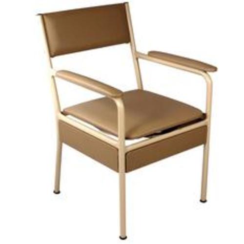 A height adjustable bedside commode chair. Features a stainless steel frame with anti-slip rubber tips, height adjustable legs, padded vinyl armrests and backrest. Includes three sided skirt to hide pan, for an enhanced appearance as a bedside chair. Available in standard and wide widths, with replacement pans and lids sold separately if required. Brown colour only.