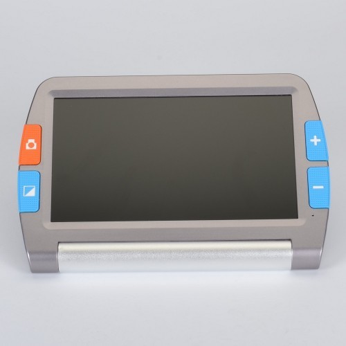 A Handheld electronic reading aid with 2.3 times to 19 times continuous zoom magnification, foldable writing stand / handle and clear reading image. 5 megapixels, antiglare screen, 12 different high colour contrast modes, 7 inch LCD display screen, freeze image and zoom functions,