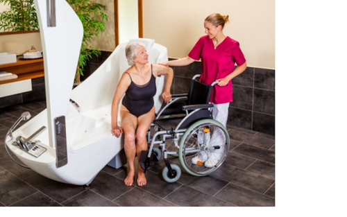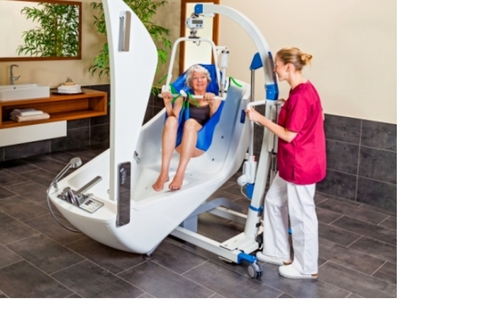 A freestanding full size bath featuring a tilting mechanism and a side door to aid standing, sliding or hoist transfers. The bath is accessible by mobile hoist. It features a contoured seat and back.