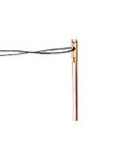 Packet of twelve hand-sewing needles in three sizes. The needles have a gap at the top of the eye for easy threading. Place the cotton thread across the small V shape at the top of the needle and pull it down to slot the thread into the eye of the needle.