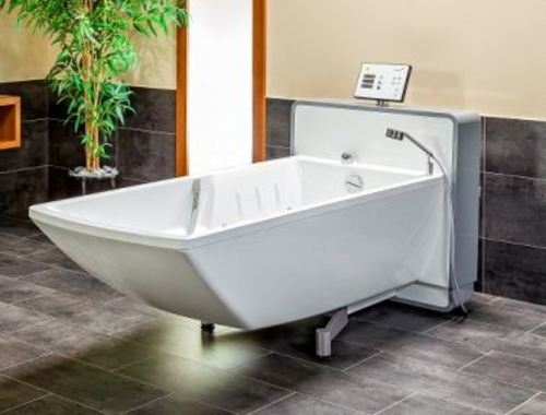 A free-standing height adjustable bath that allows access underneath from three sides. Features include hand shower, digital temperature display, double scald protection for shower and spout, contoured bath support surface with lowered foot area and contoured armrests with grab handles. Suitable for use with most standard mobile hoists. A range of options is available.