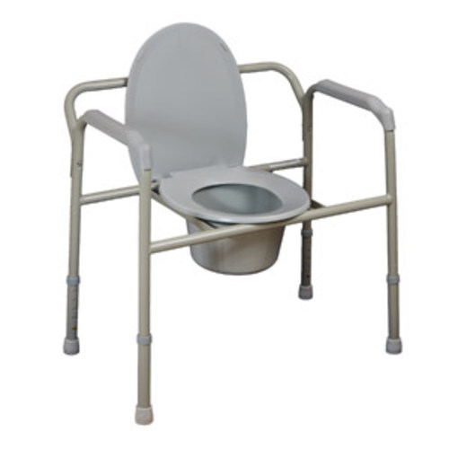 A height adjustable over the toilet frame and commode chair that provides a stable raised seat to assist in toilet transfers. Supplied with a splash guard and commode bucket and lid. Features a removable back support which allows lid to be lifted and supported when being used as a commode chair. Only one model available, suitable for bariatric use.
