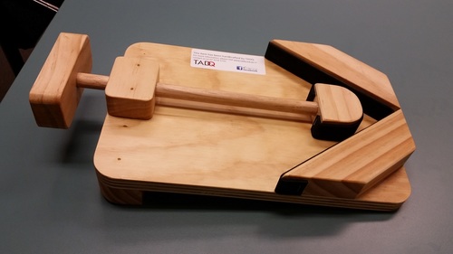 A clamp which can be used on a table or bench to stabilise jars or tins whilst they are opened. It consists of a wooden base with a lip to overhang the edge of a table or bench, a V-shaped wall at one end lined with foam and a wooden ram. The ram has a broad handle. With the clamp holding the jar, one or both hands can be used to open the lid. Suitable for one handed use or by those with limited strength or grasp.