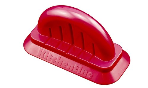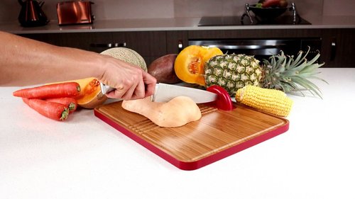 The Kitchentine cutting board consists of a knife guide and leverage cutting system to provide assistance is chopping food. The knife guide stabilises the knife for a safe and accurate cut. The cutting board can be used with most knife sizes and is constructed of bamboo.
