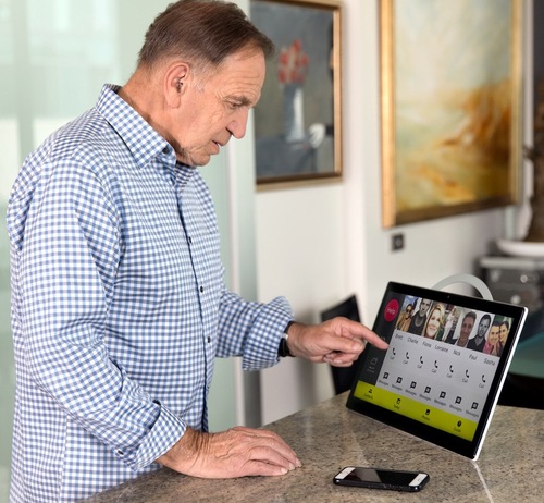 A large 17-inch touch screen that acts as a hub for communications and entertainment and alerts managed by a family carer group. Telephone calls can be made directly from the device by touching the image of the person to be called. Multiple reminders can be set and alerts can be sent to multiple people at once, accessed via a smart phone app. Other features include loud and clear sound quality, a message function, medication reminder system, alerts to carers via an on screen help button or a wearable help button, device can be linked to smoke and gas detectors etc. Photo albums can also be screened on the device.