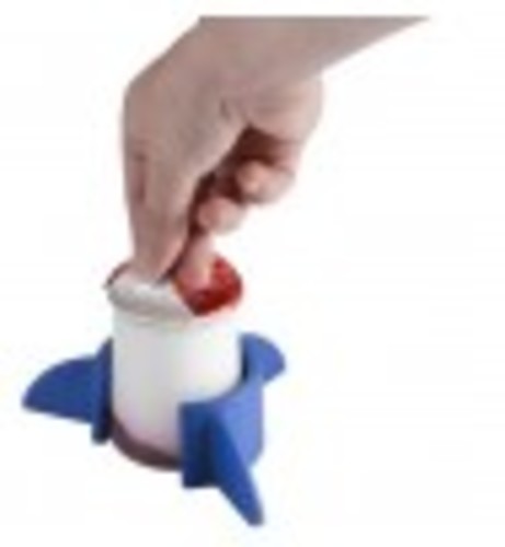 An anti-skid holder designed to stabilise small containers, e.g. yoghurt tubs, to prevent spilling contents whilst opening the lid or eating. Flexible rubber material expands to suit containers from approximately 55-80mm diameter. Available in four colours: blue, orange, purple, white.