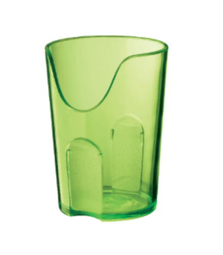 A cup with a cut out in the rim. This allows room for the nose and minimises the need to tilt the head backwards while drinking. Available in blue and green.