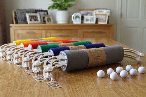 A knitting aid lap support designed to hold knitting needles to enable supported knitting or one handed knitting. The frame has a padded cushion and comes with four pairs of of Knitting Aid Beads. Each pair has a different size hole running through the centre to fit different size knitting needles. The beads are positioned in the wooden frame and hold the needles in place. Tension on the beads is adjustable. The padded frame cover is available in a range of colours.