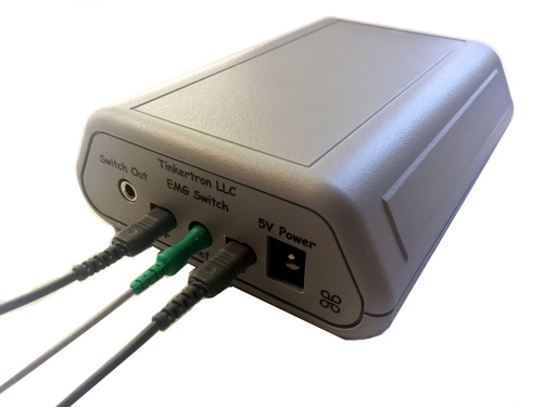 The Tinkertron EMG switch is a switch that can be activated by very small individual muscle activation. The switch interface can be used as an emergency alert, mouse click, wheelchair control and switch control for communication devices. It has an activation time of 10ms and adjustable threshold for more accurate use. An onboard digital processor assists in determining intentional weak movements. Power is provided via USB, wall plug or an extra battery pack.
