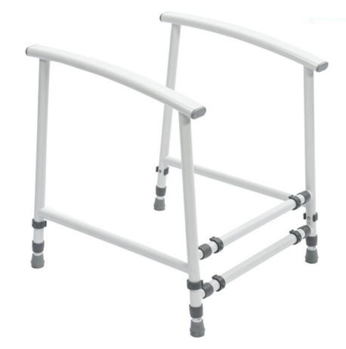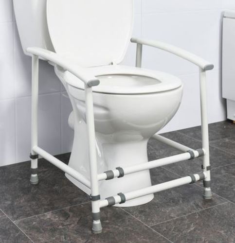 A free standing height and width adjustable toilet frame made from powder coated steel. The frame has padded moulded armrests and non-slip rubber ferrule feet for stability.