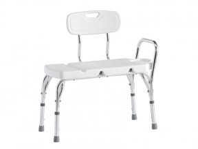 A plastic bath transfer bench with aluminium frame designed to assist a user to transfer into the bath. The bench has drainage holes across the surface, is adjustable in height, has non slip rubber stoppers on the legs and has a handle to hold at one end. Available in two sizes and white only.