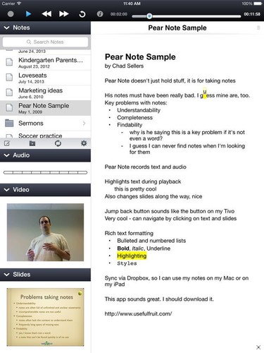 Pear Notes integrates text notes with audio. Pear Notes allows users to record audio that corresponds to a particular point in their notes. Images and photos can also be added inline with corresponding text to add more to your notes.