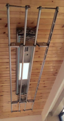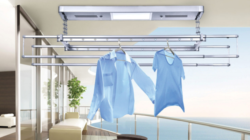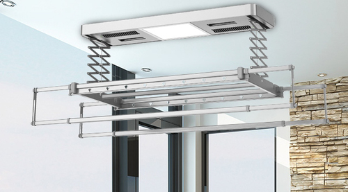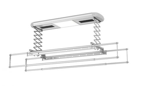 A remote controlled indoor clothes line made with aluminum. Features include LED lighting, fan and heater, safety cut out switch, obstacle blocker, and wireless remote access up to 30m from home unit. Three models are available.