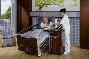 A fully adjustable electric bed with a lateral tilt. Features include handset and foot controls, a full length side rail with a double locking mechanism and removable head and foot ends.