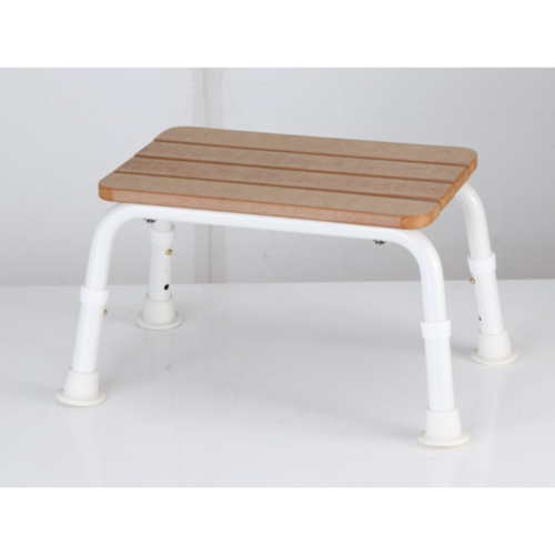 A timber looking, height adjustable bath seat with slatted surface. It features slip resistant rubber feet.