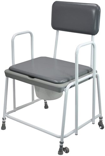 A height adjustable bedside commode with a padded backrest and seat cover. It can also be used as an over toilet frame. It features castors for ease of transport. 7.5 lite commode bucket and lid with vinyl padded seat cover for discreetness when not in use.
