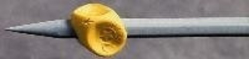 A small, moulded plastic pen holder with 3 indentations around the outside for thumb, index and middle fingers, and a hole through the centre to accommodate the pen or pencil. An arrow printed on the grip indicates the position of the stetro on the pencil or pen; thumb position is also marked on the appropriate indentation.