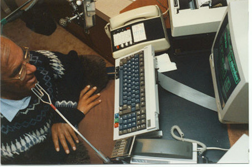 An aluminium mouthstick with an M-shaped mouthpiece. The mouthpiece and shaft are covered with tubular plastic. It can be used with an M-stand which consists of a G-clamp, spring-loaded microphone clamp and a plastic holder to allow the mouthstick to be parked and picked up without assistance.