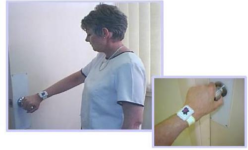 As person approaches an exit door fitted with an alarm kit the wrist transmitter sends out a radio signal. The signal is picked up by the door alarm and identifies that the wanderer is nearby. When the door is opened the door responder triggers an audible alarm and sends a radio signal back to the nurse station alarm panel, host computer or paging transmitter depending on the type of nurse call system in use.