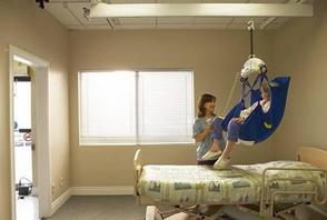 The transpoint lift can be used to transfer a person from room to room, including rooms with different ceiling heights, through doors with door headers. Each lift system is fitted with a set of attachment rings that are used to facilitate the transfer hook up. One transfer strap is required for each track transfer point.