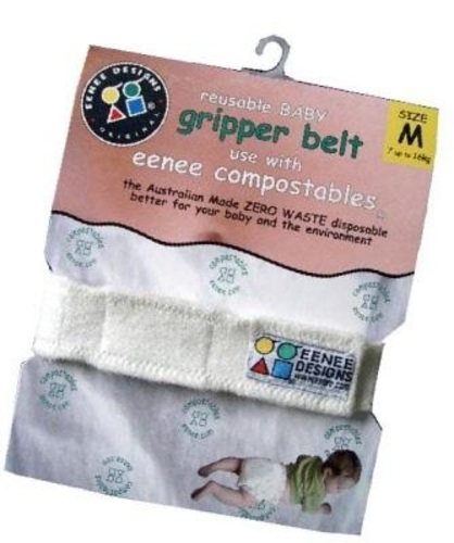 The belt is intended to be used in conjunction with Eenee compostable nappies that do not have plastic tab fasteners. It may also be used with cloth nappies.