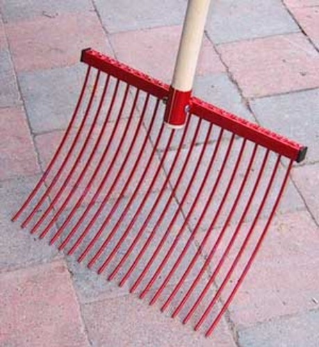 A wooden long-handled rake with curved high grade spring steel tines that enable the user to rake and shovel leaves/weeds.