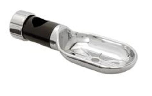 The soap dish is attached to the rail by removing the end cap and inner clamp on the soap dish arm, placing the arm around the rail and replacing the clamp and end cap.