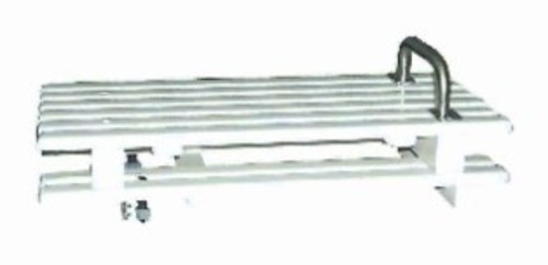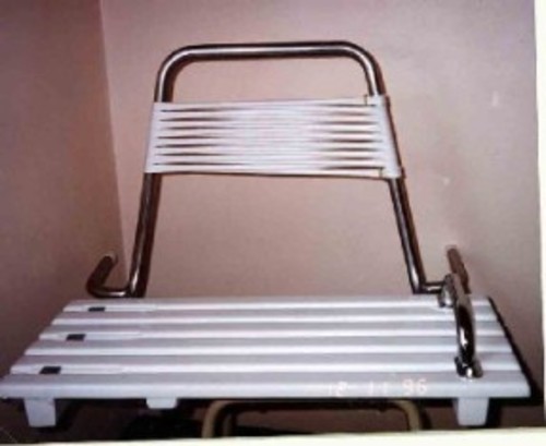 A wooden slatted elevated bath board with a handle on one side. A bracket on the underside adjusts to fit the internal width of the bath. Available in four standard heights. A stainless steel soft backrest with rear anti tip legs is optional.
