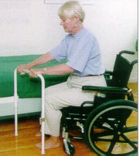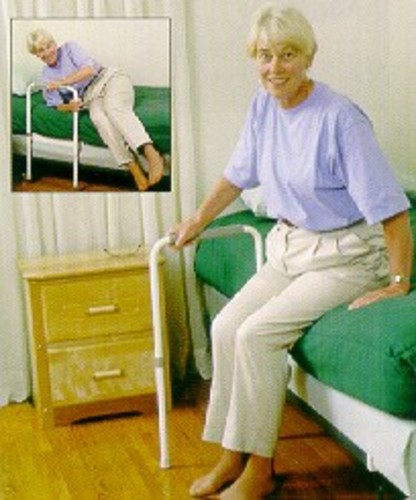 A strong tubular steel hand rail on two legs. The hand rail is attached to a frame which sits underneath a mattress. The rail locks at the bedside to assist with bed mobility and can be lifted to unlock and swing out to provide support while transferring. It can be used on either side of the bed. This product is not compatible with electric style hospital beds.
