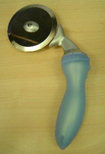 The Pizza Wheel consists of a large, contoured, soft, rubber handle, circular, stainless steel cutting head and angled shaft. May be used with the right or left hand.