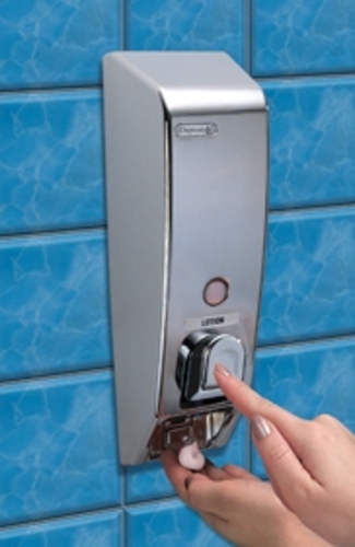 A wall mounted liquid dispenser designed to pump items such as lotions, , shampoos, and soaps into the user's hand. Unit is available with one to four separate compartments and is available in a range of colours. To operate unit the user presses the appropriate button and the liquid is dispensed.