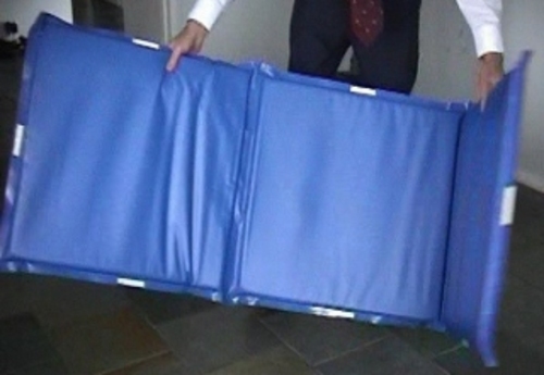 A soft, padded mat for people at risk of falling out of bed or from a chair, designed to minimise jarring from a fall. The mat has a smooth wipe-clean surface and fully welded seams. Gripping rubber patches on the bottom of the mat reduce slippage and glow strips on the side alert night staff to its presence.