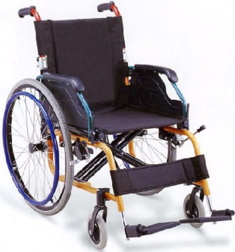 A lightweight, self propelled wheelchair featuring a multi coloured folding, aluminium frame. The chair has a folding backrest, lift up armrests that fold behind the chair and fixed adjustable height footrests. Available in one size only.