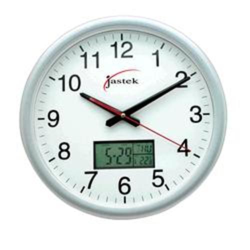 A large 300mm diameter clock with an easy to read analogue time and LCD digital display. This clock also displays the day, month or temperature.