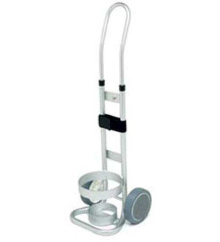A metal, height adjustable trolley designed to carry oxygen cylinders. Available in a steel model or aluminium model. Designed to accommodate various sizes of oxygen bottles.