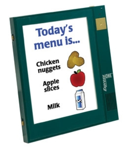 A voice-output communication device which enables a single message to be produced. Messages are stored with digitised speech. Touch the picture or the play button to speak the message. The Express ONE has wall mount slots on the back so the device can be used as a talking sign. Volume is adjustable.