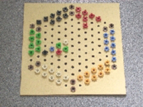 A game for two to six players consisting of a board with a formation of holes in a hexagonal design and sets of nine pegs in six different colours. The object of the game is to be the first to occupy the facing parallel nine hole sector.