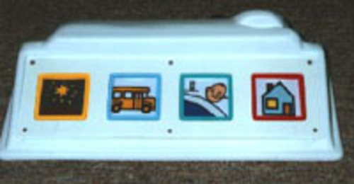 A speech generating device which has 4 message locations in a line. Messages are stored with digitised speech. Messages are stored under single cells. Can be customised.