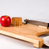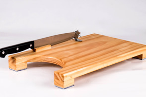 A solid pine chopping board with a long stainless steel knife which is attached to the board at its tip. The board has a cut out allowing a plate to rest flush with the board for easy removal of food. Spikes can be added to this board to secure food for chopping.