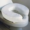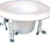 A custom made static commode chair with a padded upholstered seat and back cushion so it has the appearance of an armchair. A pan holder is fitted beneath the seat. The frame is PVC tubing.