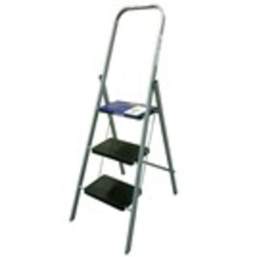 The three step ladder has a tubular safety rail which provides security and balance. The steps have a slip-resistant ridged surface. The feet have rubber stoppers.