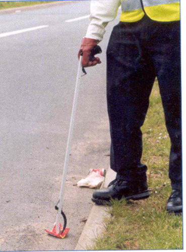An aluminium reaching stick which is suitable for rubbish collection. It has a plastic trigger style handle with a plastic claw for gripping. The reacher has reflective properties to increase visibility when there is low lighting.