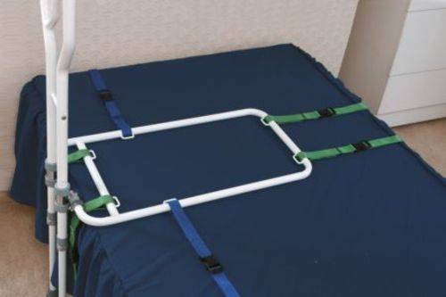 Method of use: Frame is secured in place under the mattress using three colour coded straps. The two legs of the grab rail rest upon the floor. The mattress does not have to be lifted off to install it, if the strap can be pushed with the arm as far as possible under the mattress and then the strap is pulled through from the other side of the bed.