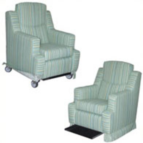 A fully upholstered, steel and timber frame, mobile lounge chair with a slide out footplate. Features four lockable castors, anti-tip rear wheels, and push handles. Available in a range of models.