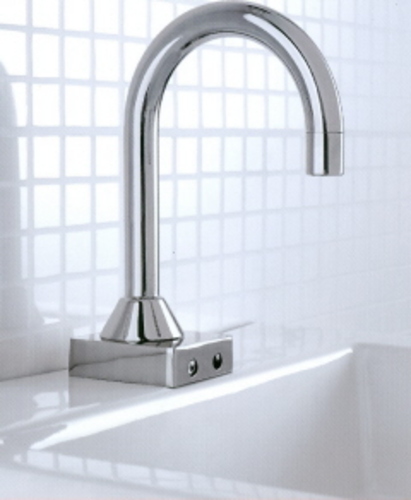 The unit features a stainless steel outlet with an infrared sensor positioned at the junction of the outlet and handbasin. The sensor is connected to the plumbing intake via a soleniod, which allows water to flow when a hand/s or another object is detected in the hand basin. The water flow will cease when the hand or object are removed from the basin, or after a pre-determined length of time has elapsed.