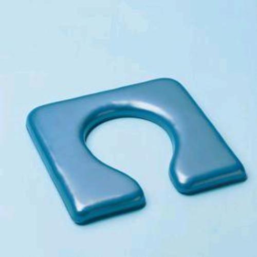 Square, vinyl covered foam cushion with circular cut out designed to fit over toilet seat on a commode. The cushion is waterproof and has ties at each corner for fastening to the frame. It is available in the colours white and blue.